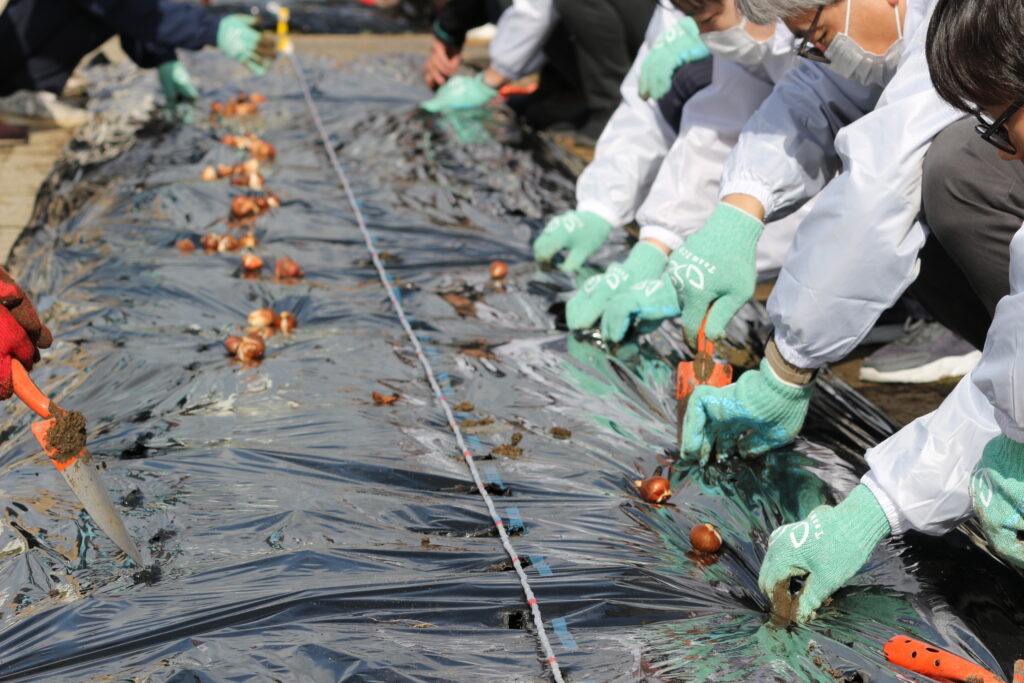 今回は長さ約100メートルの花壇に、なんと1,000球のチューリップの球根を植える作業に挑戦!