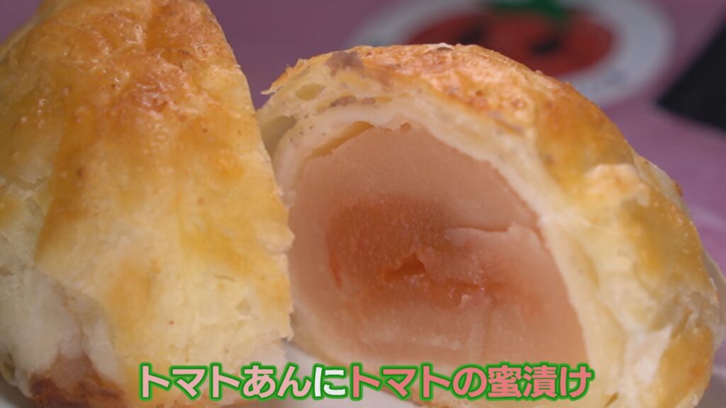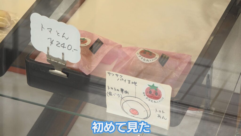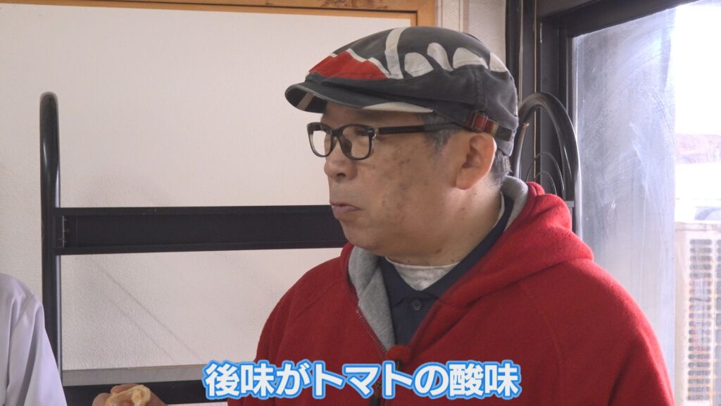 みつる先生は、豊栄産のトマトを使ったお菓子「トマとん」をいただきます。