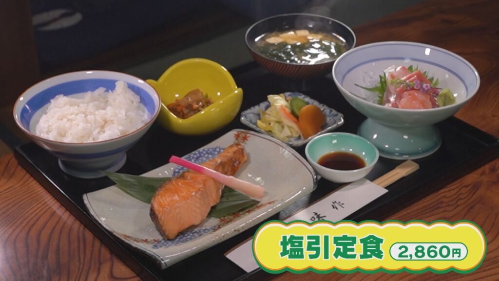 みつる先生は塩引き鮭とお刺身がついたぜいたくな定食