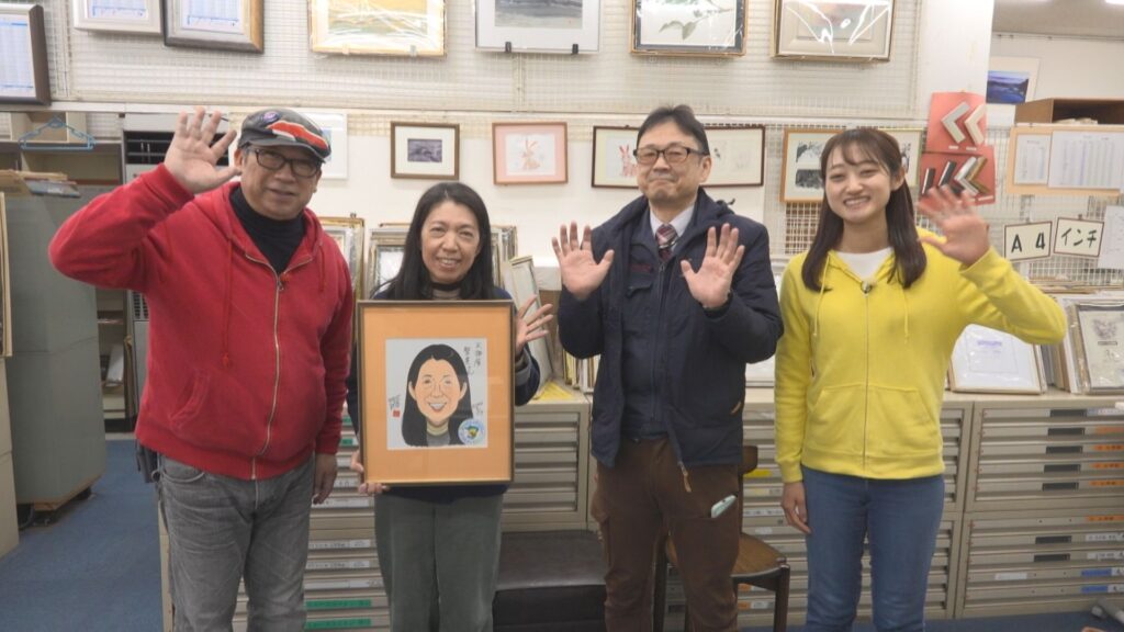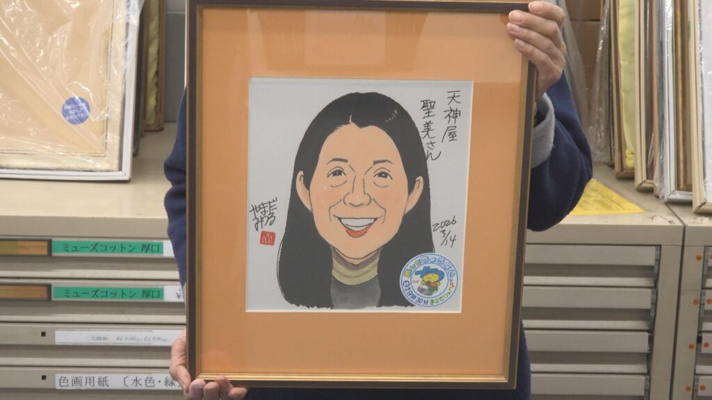 今回の似顔絵は「天神屋」の青木聖美さん。額縁に飾らせてもらいました!